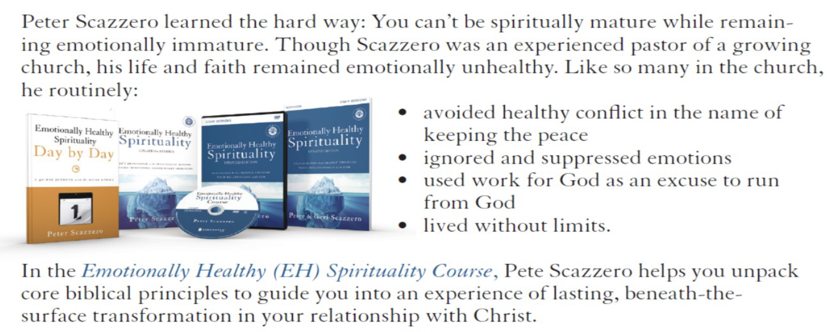 Pastor Chris invites you to join him on the “Emotionally Healthy Spirituality” journey! The “Emotionally Healthy Spirituality Course” created nothing short of a spiritual revolution in the author Pete Scazzero, in his church, and now in thousands of other churches. We will learn to integrate our emotional health and the practice of slowing down and quieting our lives to experience discipleship with Jesus that is powerfully transformative. This journey can have a profound impact on both our personal lives of faith as well as on our congregation.